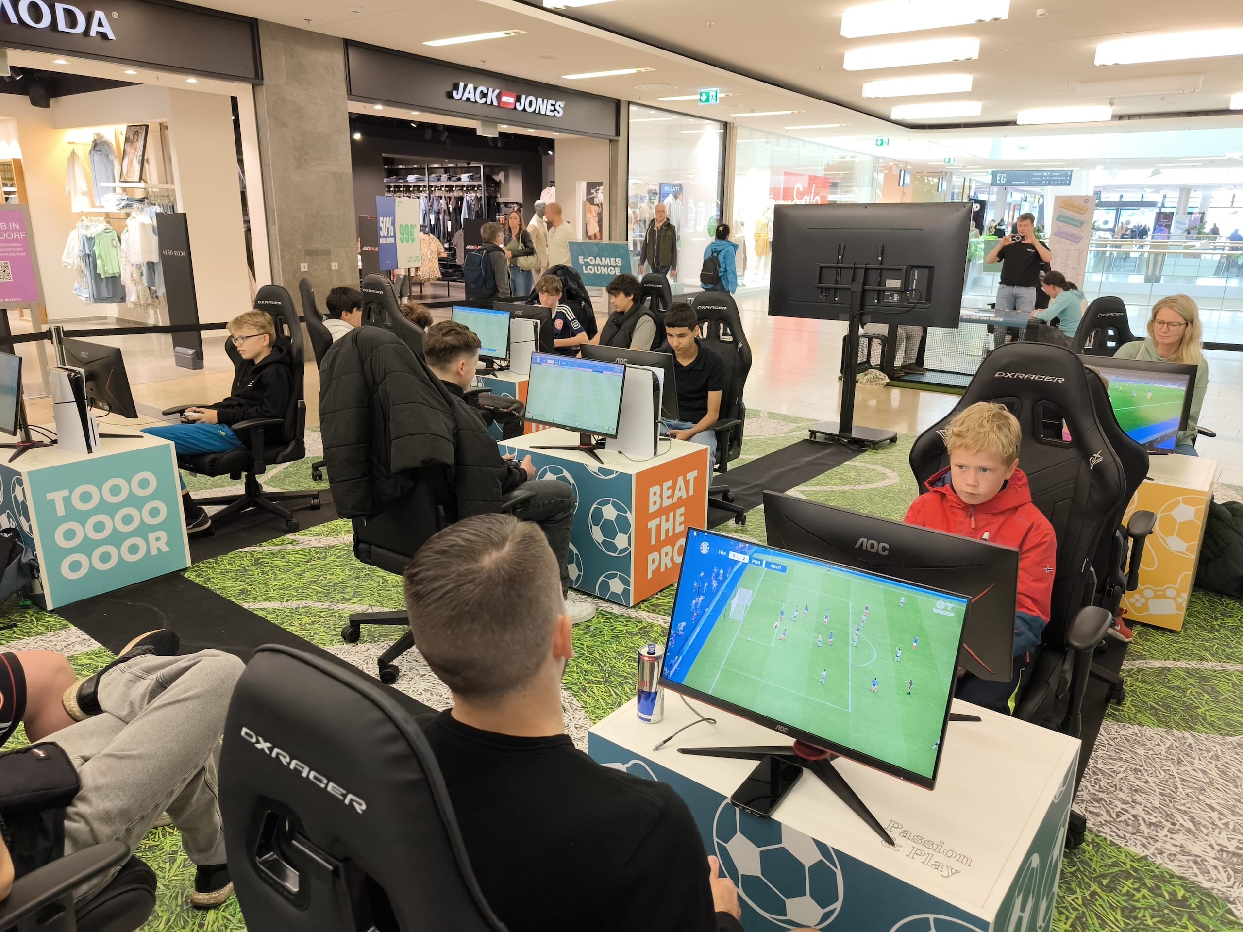 In den Düsseldorf Arcaden fanden 2 free to play Tage statt, wo jeder Besucher die Möglichkeit hatte, EA FC gegeneinander zu spielen. Außerdem hatten wir Mari vor Ort, E-Sportlerin und Content Creator von Hertha BSC Berlin. Sehr viele junge Leute im Alter von 12-18 suchten Unterhaltung und Spaß an unseren Gaming Stationen. Wir bedanken uns auch hier für die nette Zusammenarbeit und die Organisation von Iventos und den Düsseldorf Arcaden.